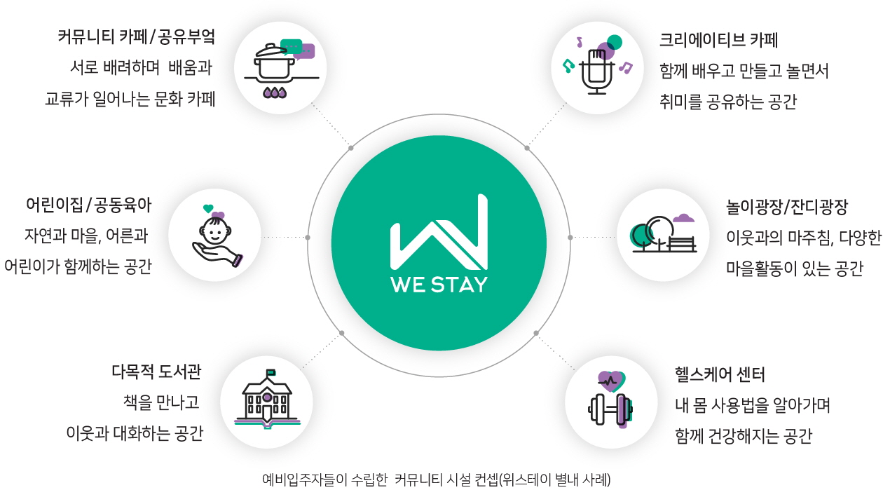 '위스테이 : WE STAY'는 국토교통부 시범사업으로 펼치고 있는 신개념 협동조합형 공공지원 민간임대주택인데요, 아파트 내 커뮤니티 공간 구성에서부터 활용에 이르기까지 모든 전반에 걸쳐 입주자가 자율적으로 참여하고 협동하는 것이 특징입니다.